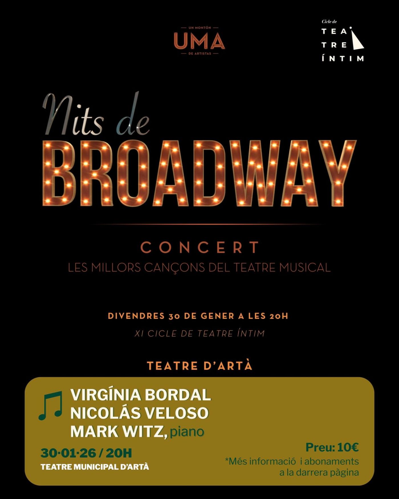 Un recorregut musical per alguns dels grans clàssics de Broadway. Dos cantants i un pianista donen vida a melodies que han emocionat generacions: des de l’enigma d’El fantasma de l’Òpera fins a la força d’Els miserables, passant per l’amor i el ritme de West Side Story i molts d’altres títols que formen part de la memòria col·lectiva del teatre musical.