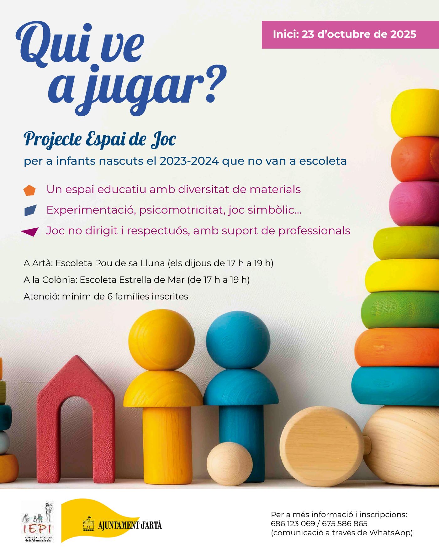 L’Ajuntament d’Artà obre el període d’inscripció per a l’activitat ‘Espai de Joc’, adreçada a famílies del municipi amb infants nascuts els anys 2023 i 2024 que no assisteixen a l’escoleta.