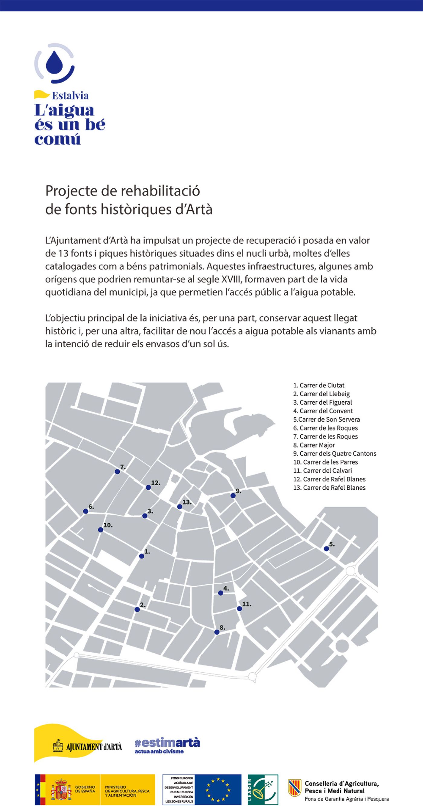 L’Ajuntament d’Artà ha rehabilitat tretze piques d’aigua ubicades a diferents carrers del nucli urbà d’Artà amb l’objectiu de recuperar-les tant per al seu ús com des del punt de vista patrimonial. La majoria d’aquestes fonts, que estaven en desús i en un estat de conservació desmillorat, són béns patrimonials i estan incloses al Catàleg de protecció del patrimoni històric i cultural del terme municipal d’Artà.