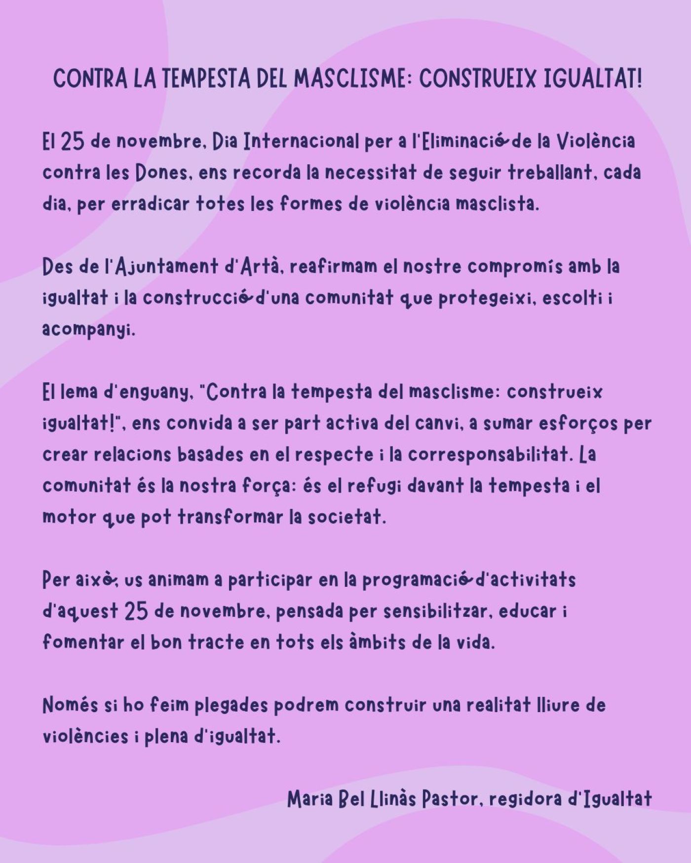 L’Ajuntament d’Artà presenta el programa d’activitats amb motiu del Dia Internacional per a l’Eliminació de la Violència contra les Dones, que enguany es desenvolupa sota el lema 'Contra la tempesta del masclisme: construeix igualtat!'. La proposta inclou activitats per a totes les edats, entre el 18 de novembre i el 18 de desembre, amb l’objectiu de sensibilitzar, educar i promoure relacions basades en el respecte i la igualtat.