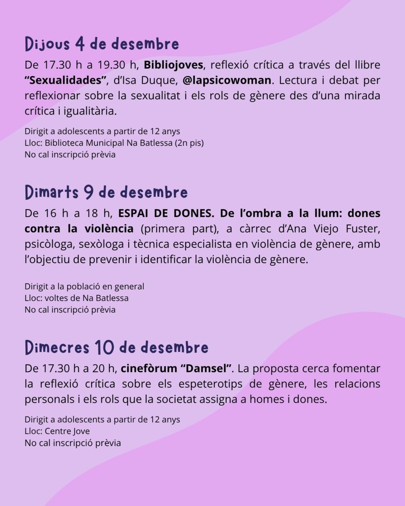 El programa comença el dimarts 18 de novembre amb un taller de Feng Shui dins l’Espai de Dones, i continua amb activitats per a joves, famílies i infants. Entre les propostes, hi destaquen el rap per la igualtat, el cine-fòrum “Brave” coincidint amb el Dia Internacional de la Infància, i diversos tallers creatius al Centre Jove.