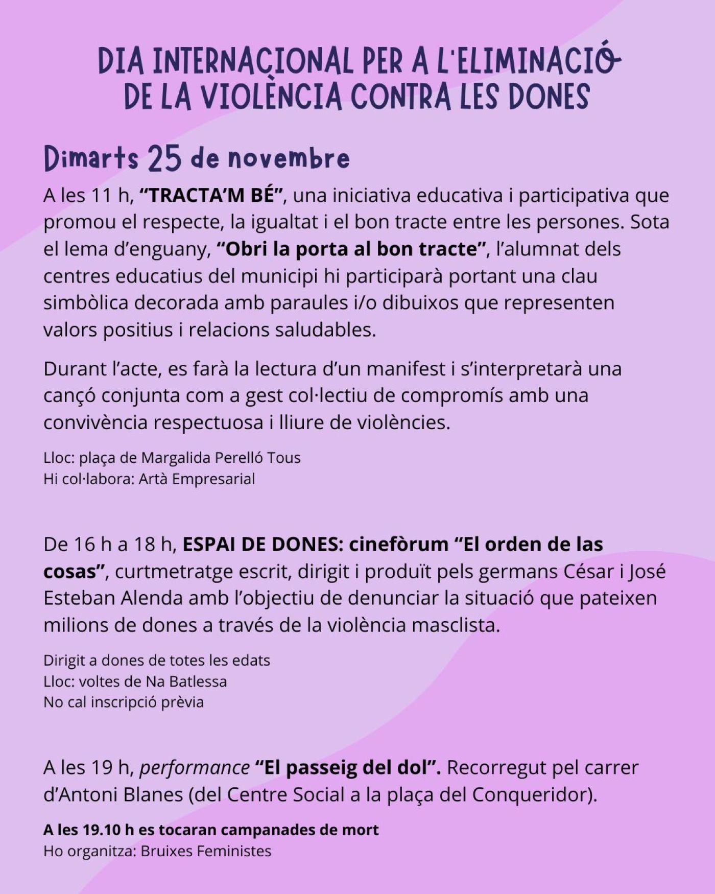 El dimarts 25 de novembre, dia central de la commemoració, tindrà lloc a les 11 h a la plaça de Margalida Perelló Tous l’acte participatiu “Tracta’m bé”, amb la implicació de l’alumnat dels centres educatius del municipi. L’activitat inclourà la lectura d’un manifest i una cançó col·lectiva com a gest de compromís amb una convivència respectuosa i lliure de violències. A la tarda, hi haurà el cine-fòrum “El orden de las cosas” i la performance “El passeig del dol”, organitzada pel col·lectiu Bruixes Feministes.