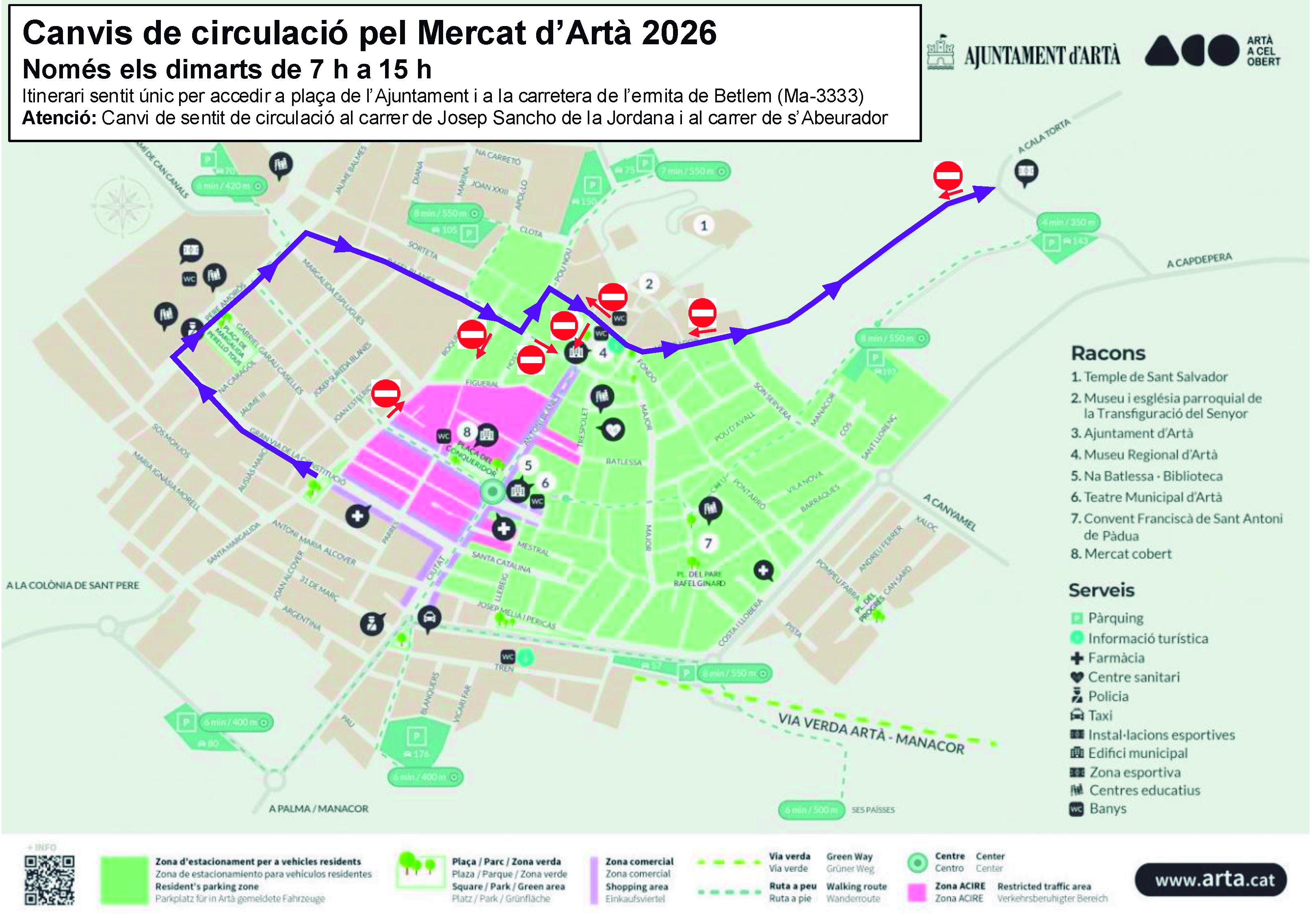 L’Ajuntament d’Artà informa que, a partir del proper dimarts 7 d’abril, i amb motiu de l’avanç de les obres a diferents carrers del centre i del muntatge del mercat setmanal, es modificarà l’itinerari d’accés i sortida del centre del poble els dies de mercat.