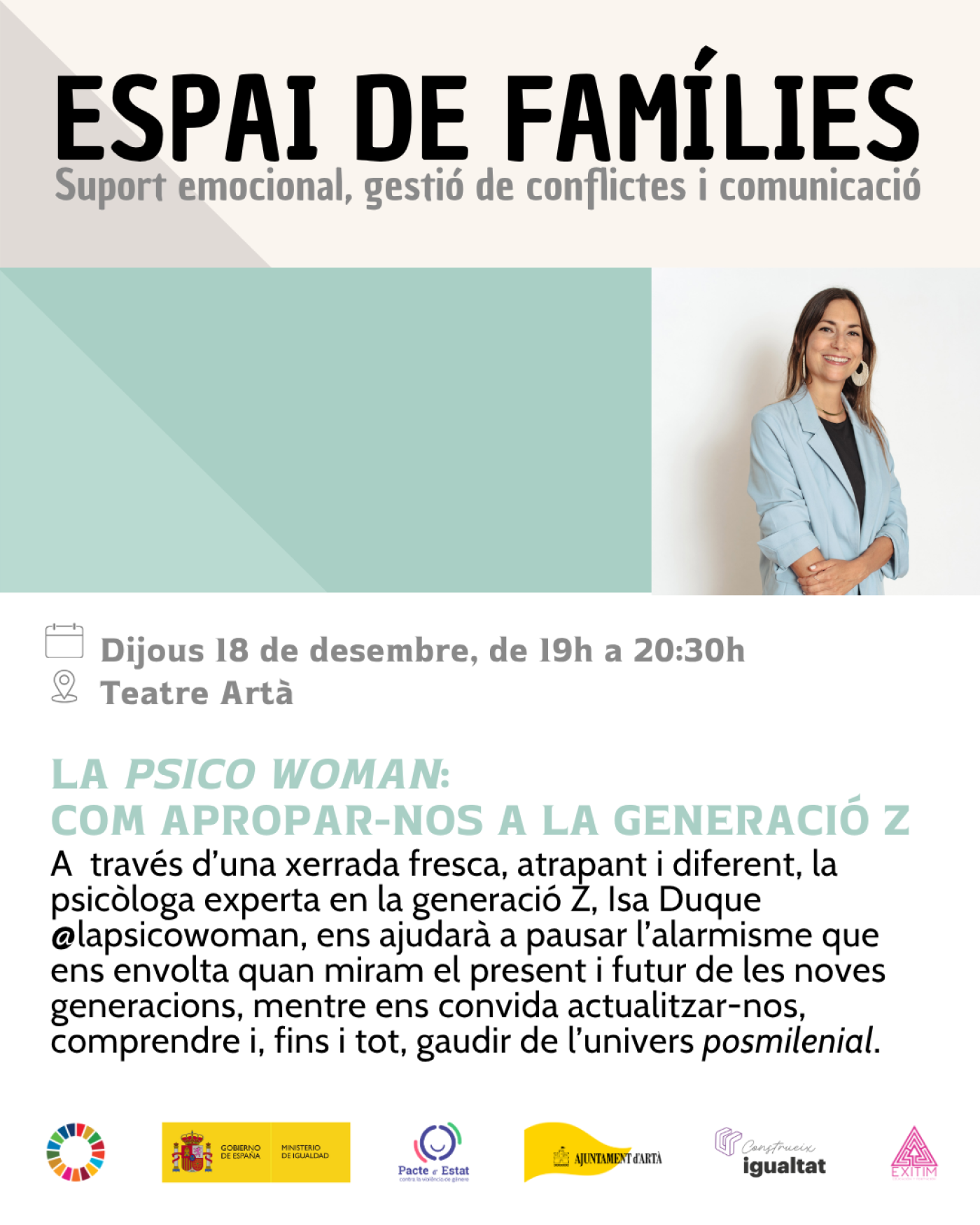 18 de desembre: La Psicowoman: com apropar-nos a la generació Z. Una xerrada dinàmica i inspiradora a càrrec de la psicòloga i divulgadora Isa Duque (@lapsicowoman), per comprendre millor els codis, les emocions i les necessitats de les noves generacions.