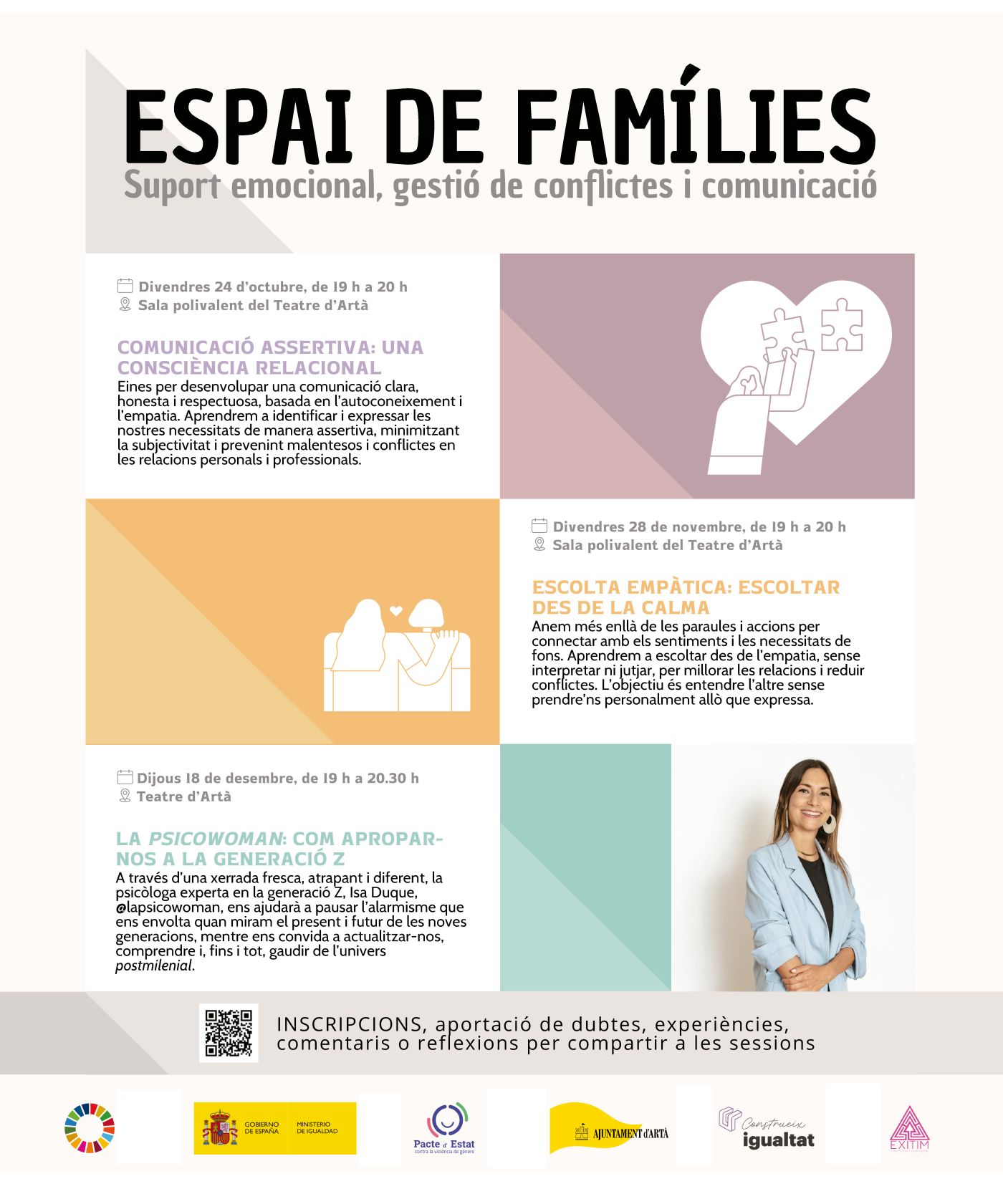 Després de la bona acollida de la primera edició, l’Ajuntament d’Artà, a través dels Serveis Socials Comunitaris Bàsics, posa en marxa la segona edició del projecte Espai de Famílies, una iniciativa de caràcter preventiu que té com a objectiu acompanyar les famílies en la seva tasca educativa i de cura, tot oferint eines pràctiques per a la gestió de conflictes, la comunicació assertiva i l’entesa emocional entre els membres de la família.