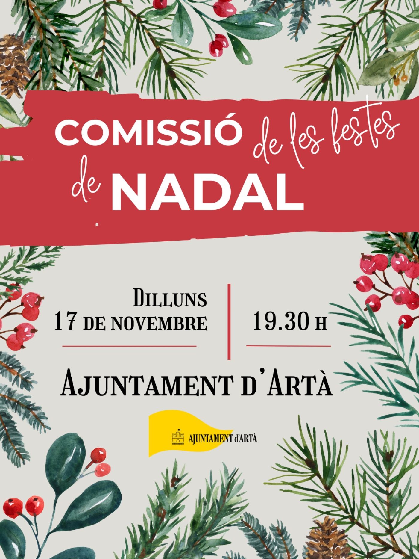 L’Ajuntament d’Artà ha convocat per al dilluns 17 de novembre, a les 19.30 h, la reunió de la Comissió de les Festes de Nadal i Reis, que tindrà lloc a la Casa Consistorial i és oberta a tota la ciutadania.