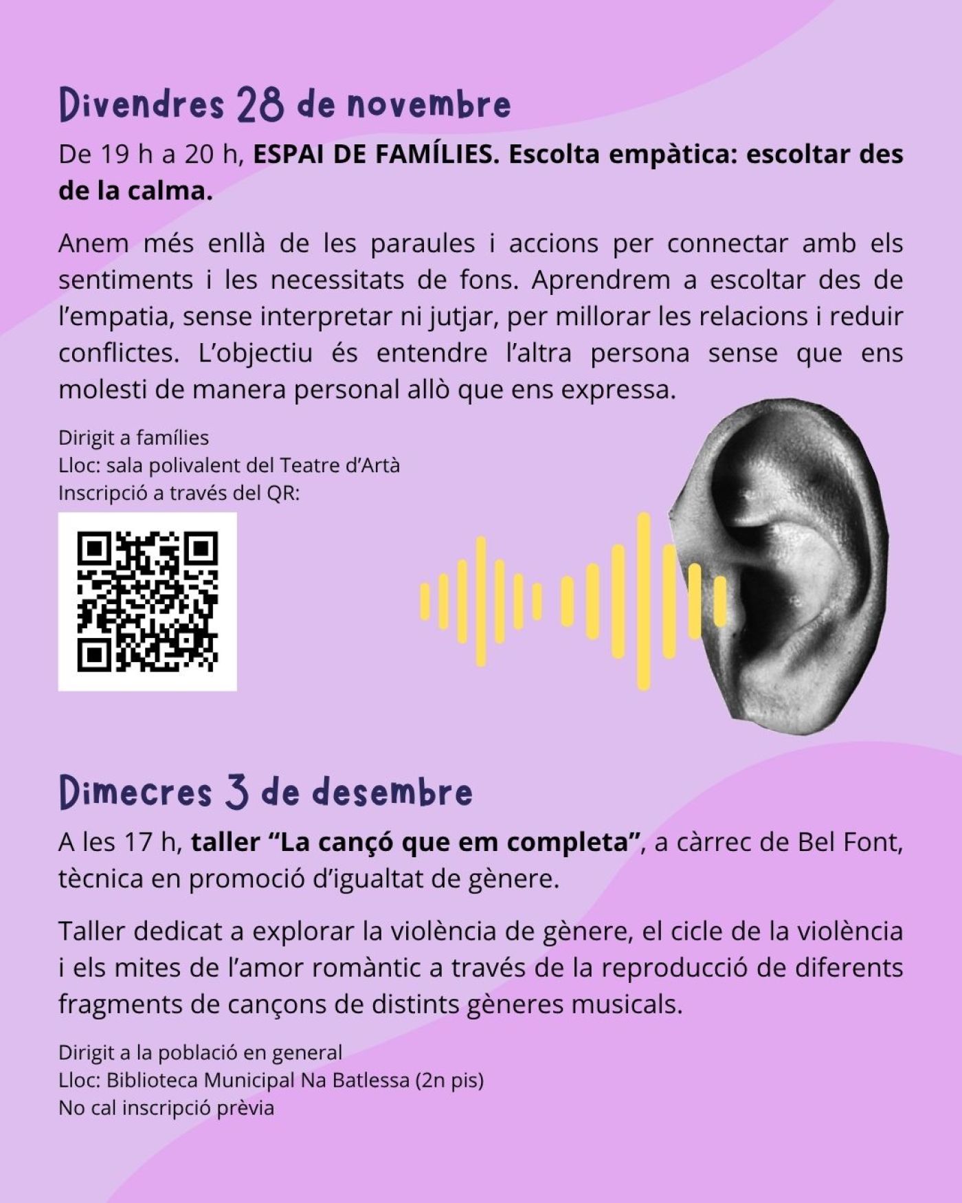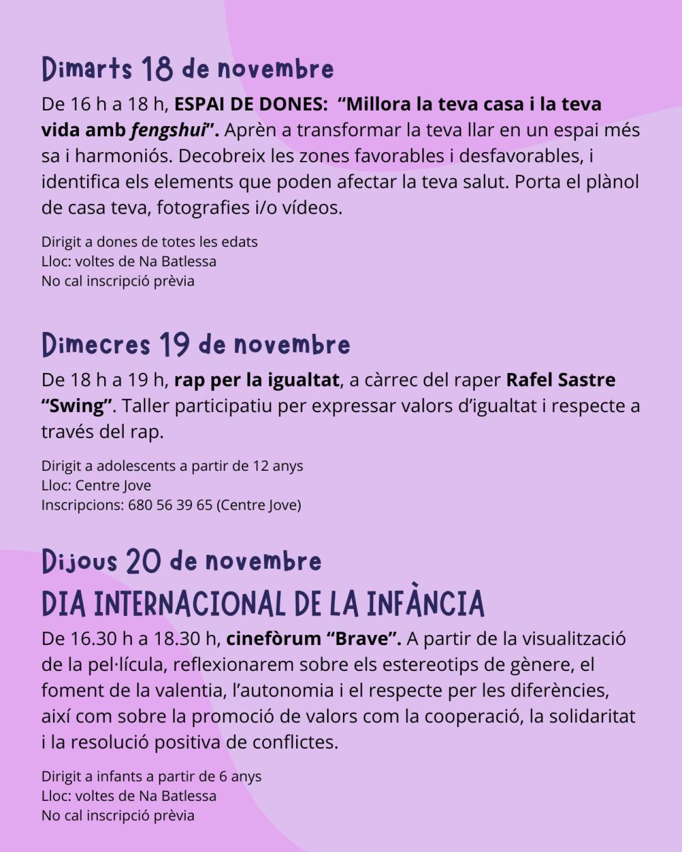 El programa comença el dimarts 18 de novembre amb un taller de Feng Shui dins l’Espai de Dones, i continua amb activitats per a joves, famílies i infants. Entre les propostes, hi destaquen el rap per la igualtat, el cine-fòrum “Brave” coincidint amb el Dia Internacional de la Infància, i diversos tallers creatius al Centre Jove.