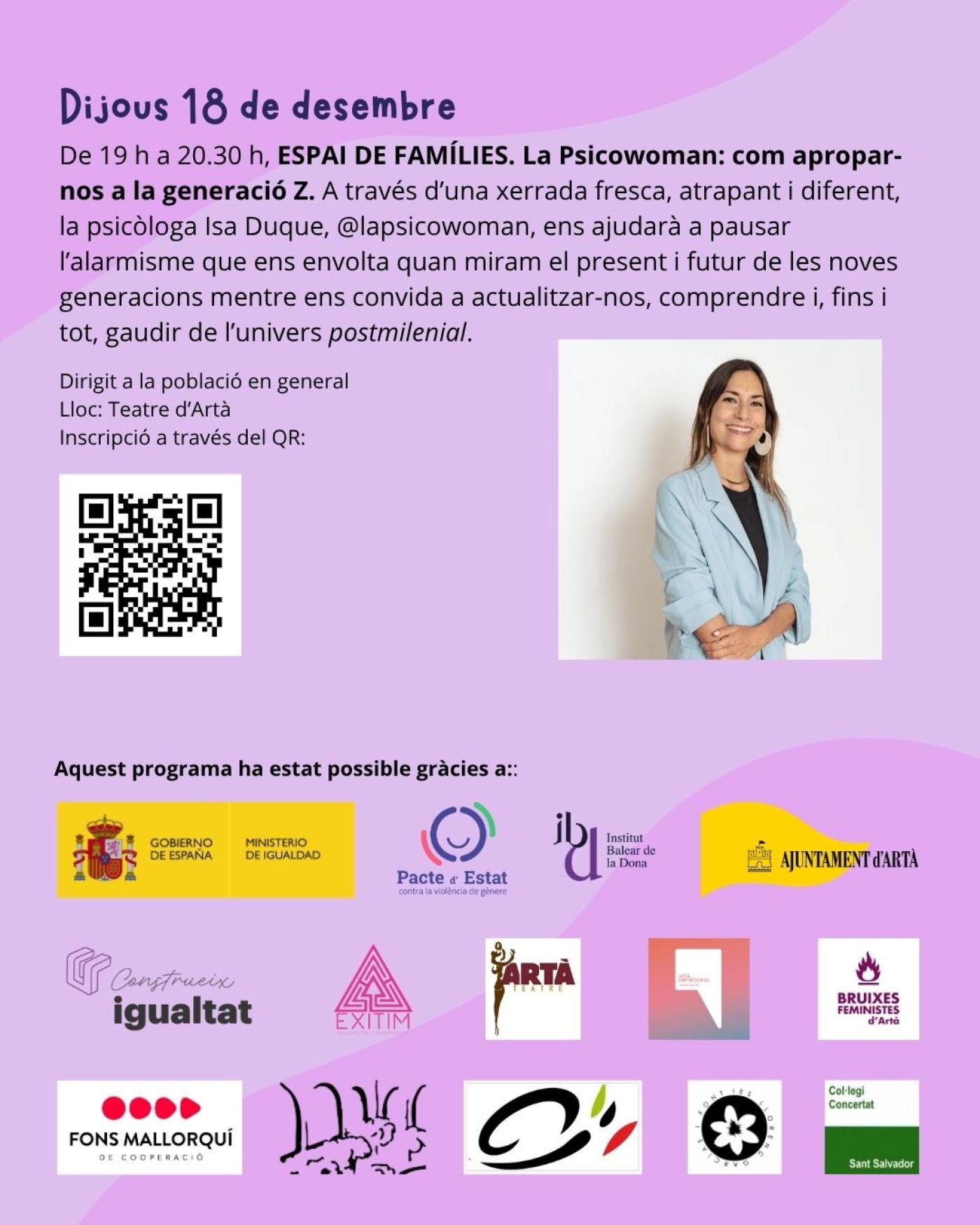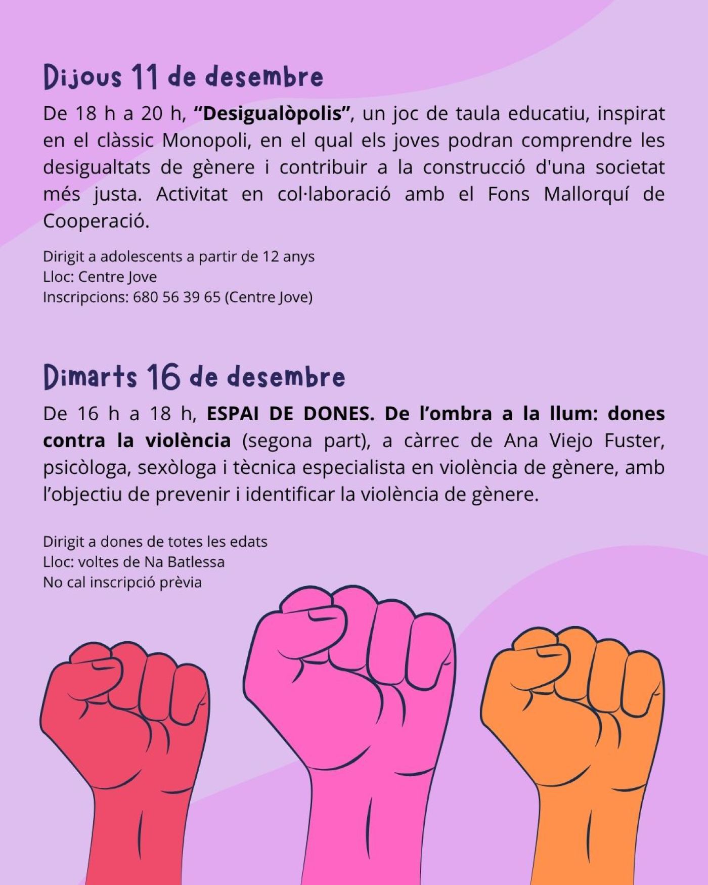 El programa es completa amb contacontes, tallers, debats i espais de reflexió fins al 18 de desembre, amb la participació de professionals com Ana Viejo Fuster i Isa Duque (@lapsicowoman), i activitats en col·laboració amb entitats locals i el Fons Mallorquí de Cooperació.