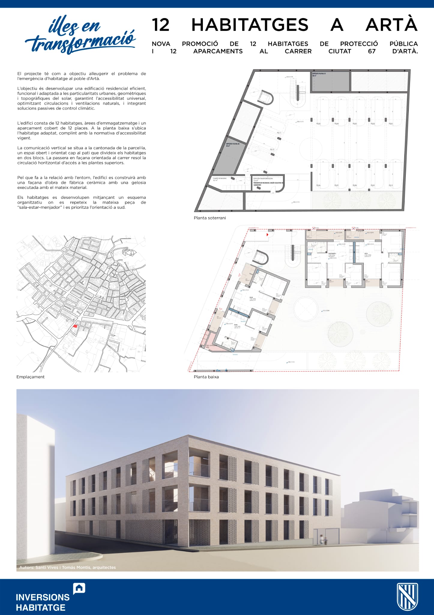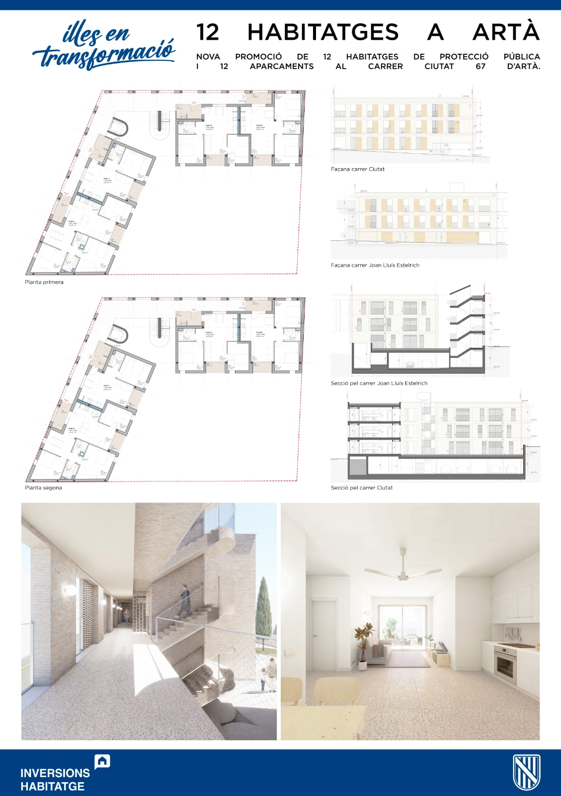 Avui s’ha presentat a la sala de plens de l’Ajuntament d’Artà el projecte tècnic de la nova promoció de 12 habitatges de protecció pública que es construirà al municipi. Els habitatges es destinaran preferentment a joves menors de 35 anys amb un mínim de 15 anys de residència a Artà, tal com va sol·licitar l’Ajuntament a l’Institut Balear de l’Habitatge (IBAVI). El projecte entra ara en fase de licitació i es preveu que dins aquest mateix any pugui ser adjudicat i s’iniciïn les obres.